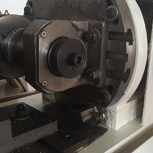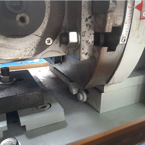 本機的兩主軸中心距調(diào)整為兩主軸座分別對中心調(diào)整,即工件滾壓時處于機器中心位置,對滾壓長工件并穿過機器較為方面。主軸軸線對臺面的夾角可在±3°間調(diào)整,滾壓時工件每轉軸向進給量